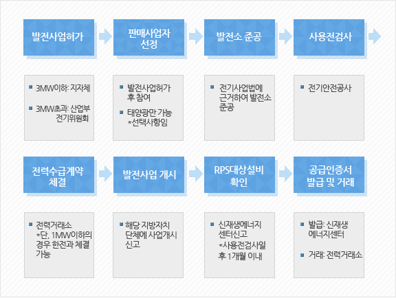 태양광발전사업자가 신.재생에너지 공급의무화제도(RPS)에따라 태양광발전장치를 설치하여 생산된 전기를 한전에판매하여 1차수익을 창출하고, 생산된 전력량에 비례 한 공급인증서(REC)를 발급받아 공급의무자(13개 발전회사)에게 판매하여 2차 수익을 올릴 수 있는 사업